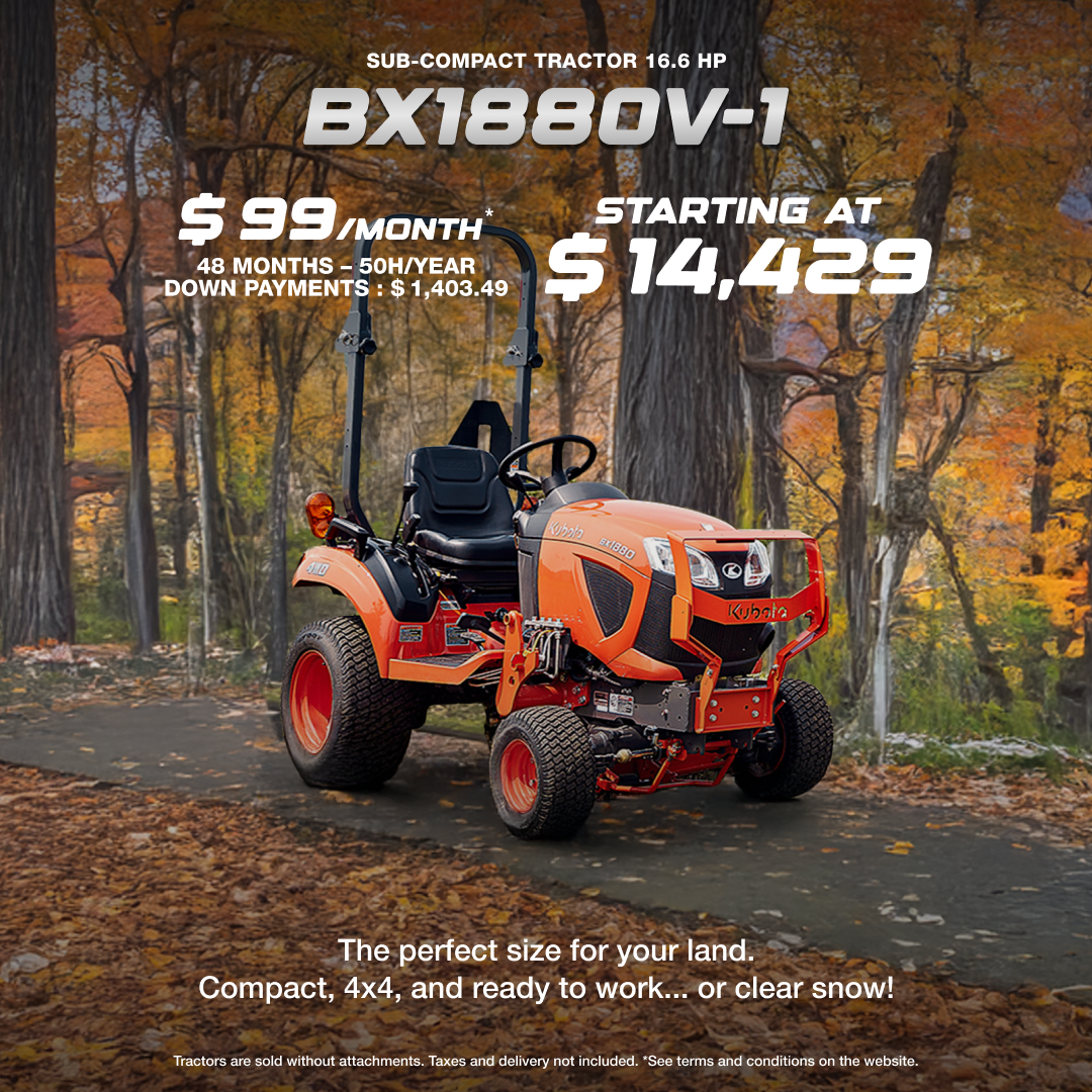 *Lease offer available on approved credit. Representative lease example based on a new and previously unregistered BX1880V-1KBT. Lease Price is $14,428.89. 0% lease rate (2.87% Effective APR) for 48 months. Monthly lease payment is $99.00 – which includes: $420.52 freight; regulatory fees (up to $3.72); lien registration fees (up to $394.00, including lien registering agent fee); as well as all other applicable fees, levies and duties (all of which may vary by region and dealer). Insurance, registration and applicable sales taxes are extra. $1403.49 down payment or equivalent trade-in and $0.00 security deposit due at lease inception. Total lease obligation is $4,752.00. Total of 48 monthly payments required during the lease term. 200 hours total; charge of $25.00/hour for excess hours. Dealer may lease for less. Dealer order/trade may be necessary (but may not be available in all cases). Offer ends November 30, 2025 and is subject to change or cancellation without notice. See your participating Kubota dealer.
