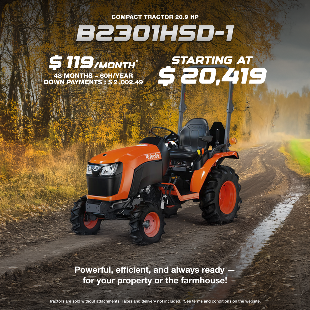 *Lease offer available on approved credit. Representative lease example based on a new and previously unregistered B2301HSD-1. Lease Price is $20,418.91. 0% lease rate (2.75% Effective APR) for 48 months. Monthly lease payment is $119.00 – which includes: $587.47 freight; regulatory fees (up to $3.72); lien registration fees (up to $394.00, including lien registering agent fee); as well as all other applicable fees, levies and duties (all of which may vary by region and dealer). Insurance, registration and applicable sales taxes are extra. $2,002.49 down payment or equivalent trade-in and $0.00 security deposit due at lease inception. Total lease obligation is $5712. Total of 48 monthly payments required during the lease term. 240 hours total; charge of $25/hour for excess hours. Dealer may lease for less. Dealer order/trade may be necessary (but may not be available in all cases). Offer ends November 30, 2025 and is subject to change or cancellation without notice. See your participating Kubota dealer.