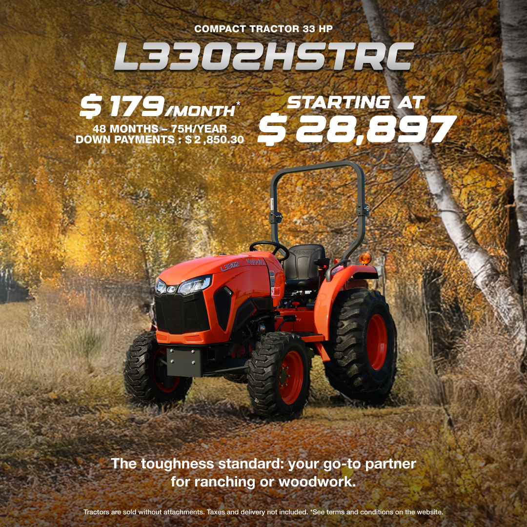 *Lease offer available on approved credit. Representative lease example based on a new and previously unregistered L3302HSTRC. Lease Price is $28,896.99. 0% lease rate (2.75% Effective APR) for 48 months. Monthly lease payment is $179.00 – which includes: $831.01 freight; regulatory fees (up to $3.72); lien registration fees (up to $394.00, including lien registering agent fee); as well as all other applicable fees, levies and duties (all of which may vary by region and dealer). Insurance, registration and applicable sales taxes are extra. $2,850.30 down payment or equivalent trade-in and $0.00 security deposit due at lease inception. Total lease obligation is $8,592.00. Total of 48 monthly payments required during the lease term. 300 hours total; charge of $30/hour for excess hours. Dealer may lease for less. Dealer order/trade may be necessary (but may not be available in all cases). Offer ends November 30, 2025 and is subject to change or cancellation without notice. See your participating Kubota dealer.